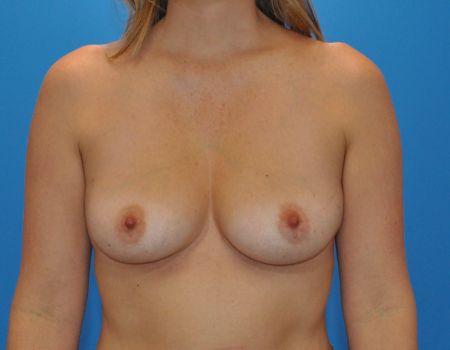 36 year old female, 5’5 and 133 lbs, desiring breast enhancement. She underwent submuscular breast augmentation with Mentor smooth round XTRA fill 350 cc moderate plus implants. Results shown are 6 months after surgery.