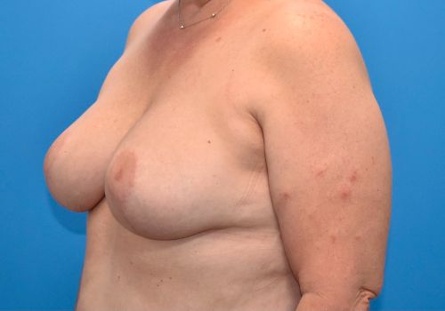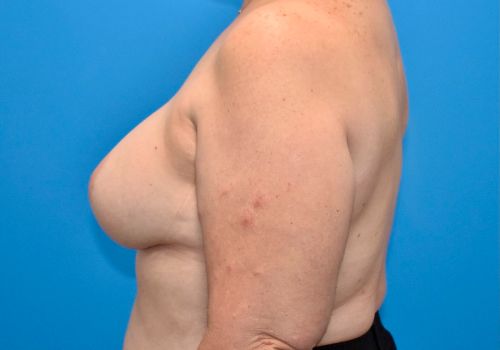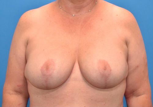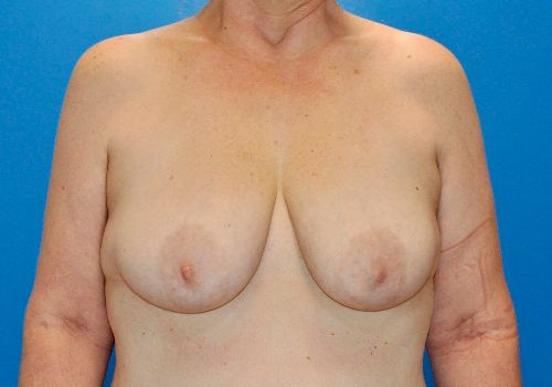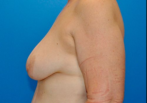 54 yr old, 5’5’’ and 175 lbs, underwent a short-scar mastopexy and 275 cc moderate plus silicone implants. Results shown are 6 months after surgery