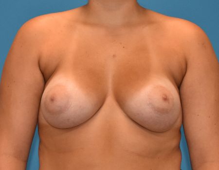 21 yr old female , 5’5’’ and 160 lbs, who had underdevelopment of her right breast and had a tissue expander placed many years ago to help with soft tissue stretch. She underwent removal of the expander and bilateral subglandular augmentation with smooth round moderate plus Mentor silicone implants, right was 325 cc and the left was a 225 cc. Results shown are 6 months after surgery.