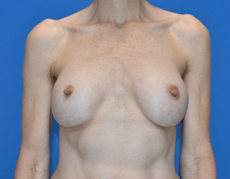 53 yr old female, 5’7 and 137 lbs, presents with contracture (scar tissue) around her right breast implant. She underwent removal of the scar tissue (capsulectomy) and replacement of her 300 cc implants with 325 cc moderate plus silicone implants. Results shown are 6 months after surgery.
