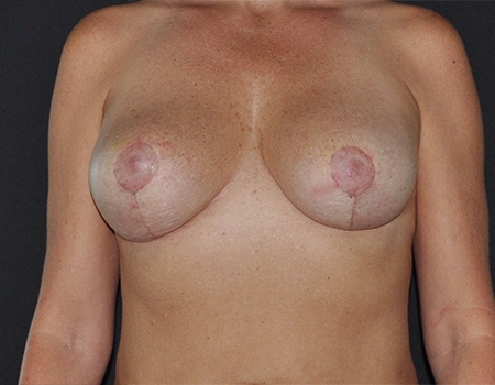This is a 44 year old female who had breast implants and is larger than a D cup breast. She would like to downsize to a C cup breast. She is 5’6 and weighs 140 lbs. She had her old implants removed which were 400 cc saline implants and had them replaced with 275 cc saline implants filled to 300 cc. She also had internal reconstruction to tighten the pocket so that the implants would not fall out to the side, and she had a mastopexy to tighten the skin. Results shown are early, only 6 weeks after surgery.