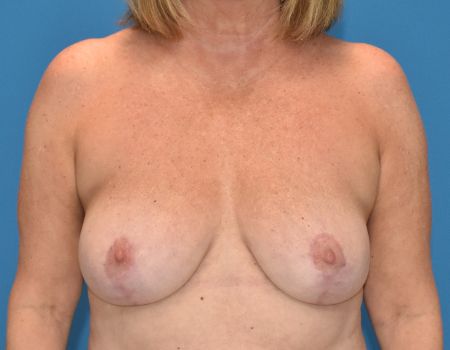 57 yr old female, 5’8 and 163 lbs, who has been bothered by the size of her breasts for years. She underwent a short-scar, superior-medial pedicle breast reduction with removal of 300 grams from each breast. Results shown are 6 months after surgery.