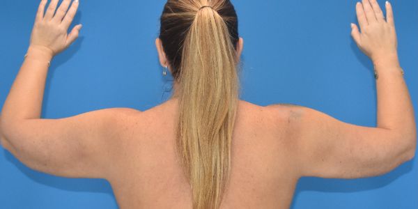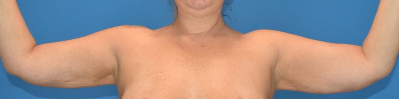 43 yr old female, 5’3 and 173 lbs, underwent liposuction to her arms with removal of 900 cc of lipoaspirate. Results shown are 6 months after surgery.