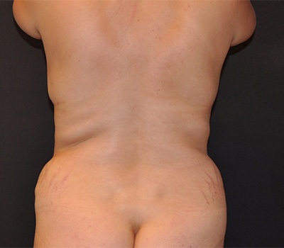 This is a very nice 28 year old female who is concerned about her back, hips and flanks appearance. She has had multiple children and is frustrated by the fullness in these areas. She has been unable to make any headway with diet and exercise. She underwent liposuction to her upper and lower back along with her hips at the same time as her abdominoplasty. She had a total of 2,000 cc of fat removed by a standard tumescent liposuction technique. The results are early, only one month from surgery. Her scars will continue to fade and the swelling will continue to diminish over the next 6-12 months.