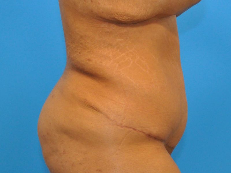 27 year old female who underwent gastric bypass and lost over 100 lbs. She is currently 5’7 and 187 lbs. She underwent an extended abdominoplasty with muscle plication and liposuction to her hips. For her breasts, she had augmentation mastopexy with Mentor smooth round high profile XTRA fill 650 cc. Results shown are 6 months after surgery.